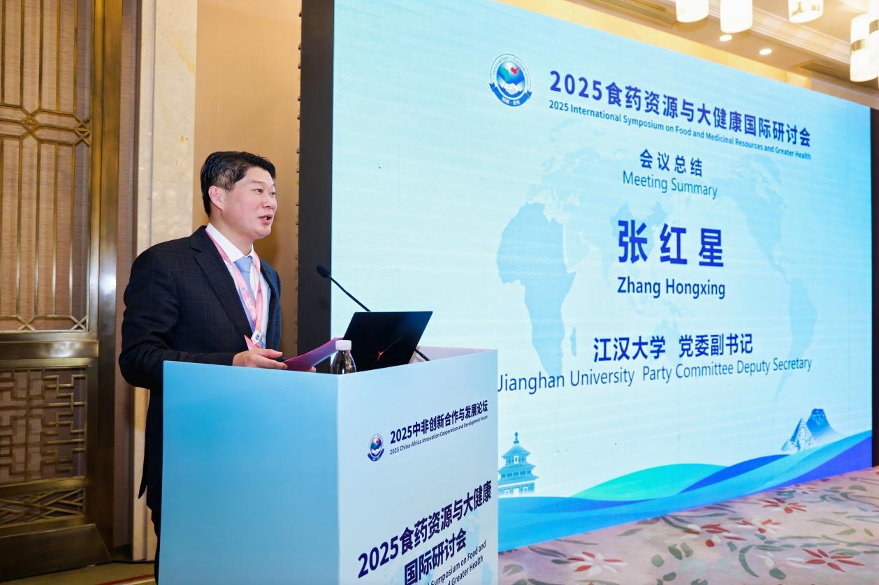 论坛期间,江汉大学副校长贾永胜出席了开幕,与中外嘉宾共同见证了中非创新合作的新启航。江汉大学党委副书记张红星参加了作为论坛平行专场之一的“2025食药资源与大健康国际研讨会”,并在研讨会尾声作总结发言。